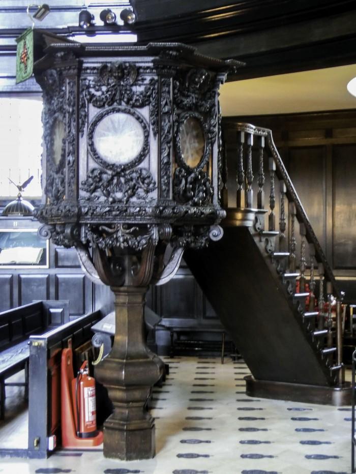 Houten preekstoel met houtsnijwerk van Grinling Gibbons. De preekstoel werd tijdens WOII bewaard in de St Paul's Cathedral.Deel deze preekstoel