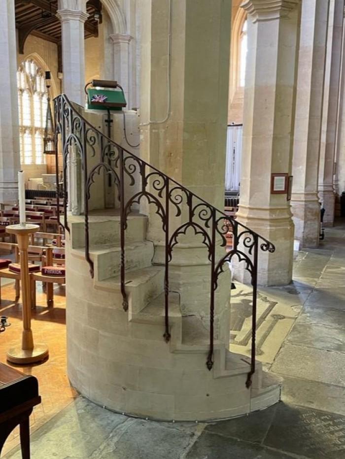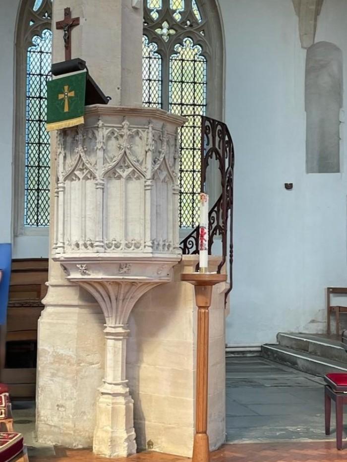 De zeer fraaie stenen preekstoel uit de 15e eeuw wordt vanwege zijn vorm een ‘beker’-type genoemd. Het is een van de minder dan zestig stenen preekstoelen van vóór de Reformatie die er nog in het land zijn.Deel deze preekstoel