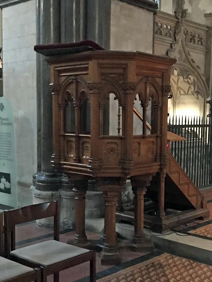 De kathedraal van Rochester is de op een na oudste van Engeland en werd in 1080 gebouwd, ter vervanging van de eerdere kerk op die plek uit 604.In het koor staat deze preekstoel uit 1872, die gebruikt wordt voor kleinere diensten, waarbij de bezoekers in het koor zitten en niet in het grote schip van de kerk.