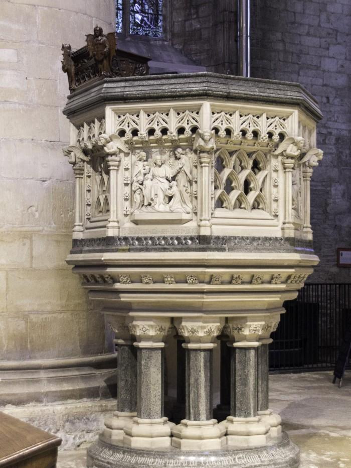 Zeshoekige zandstenen preekstoel met prachtige gravures van Christus en zijn discipelen.Deel deze preekstoel