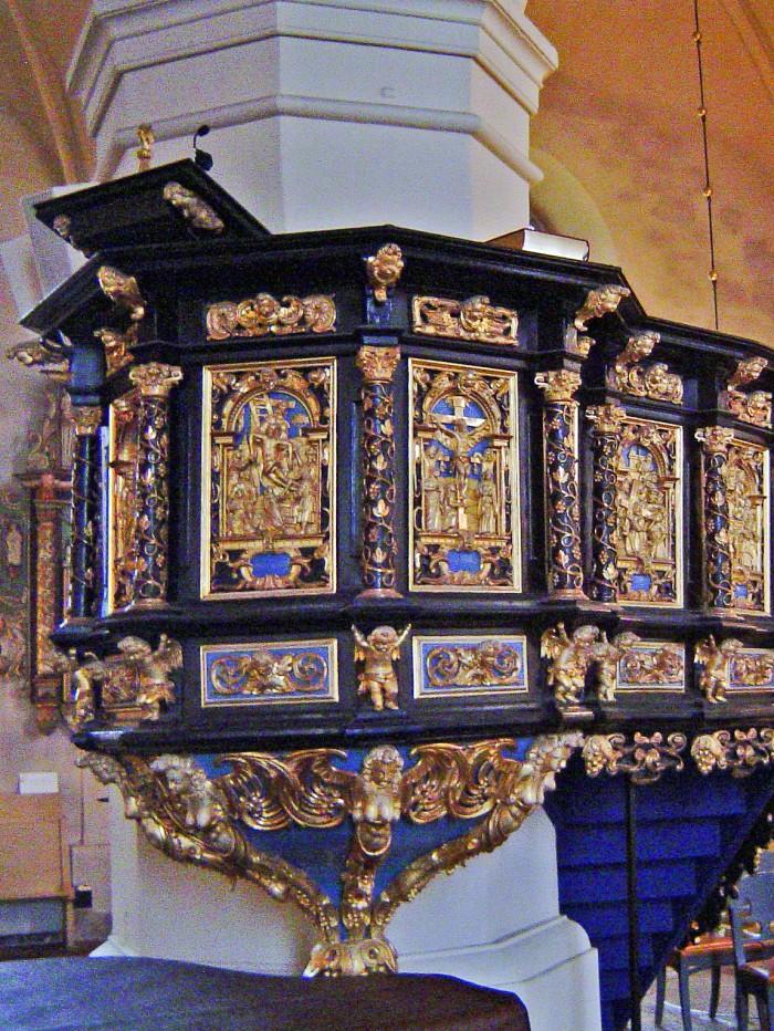 De kerk is bekend voor het altaar en de preekstoel, beide vervaardigd door Ewerdt Friis. Hij begon aan deze werken in 1657. Echter, ze waren ongeverfd tot 1746. Toen werden ze geschilderd in de kleuren blauw, grijs en goud . In de jaren 1880 werden ze bijgewerkt met de kleuren zwart en goud. Friis stierf in 1672 en werd begraven in de kerk.Deel deze preekstoel