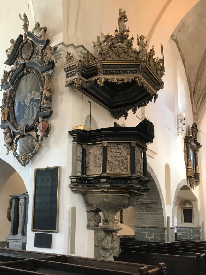 De barokke preekstoel uit 1631 is uit zandsteen vervaardigdDeel deze preekstoel