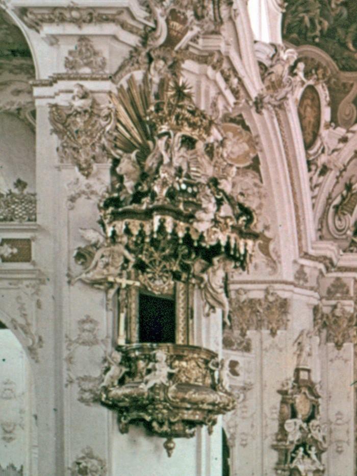 Tussen 1719 en 1735 werd door de gebroeders Asam deze barokke bedevaartskerk gebouwd, op de plaats waar al vanaf 835 een kapel bestond.Deel deze preekstoel
