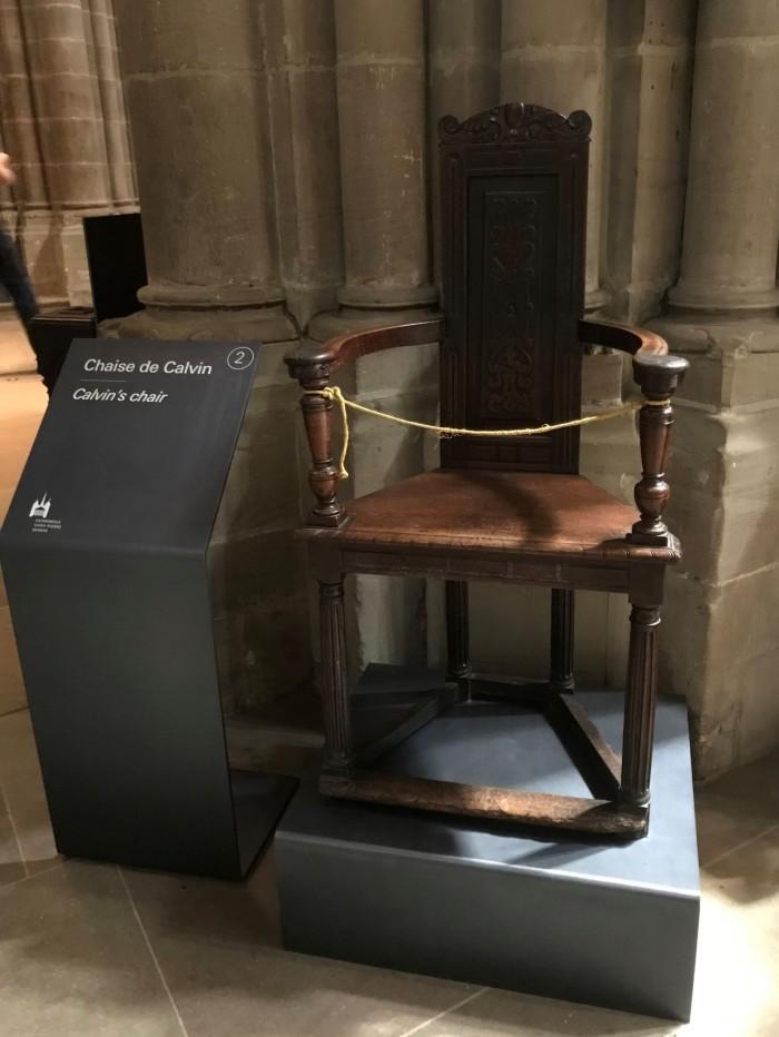 Deze kathedraal is bekend geworden als de kerk van Calvijn en heeft sindsdien ook de status van een burgerlijke tempel, waarin elke nieuwe kantonregering de eed aflegt.De preekstoel is in 1541 geplaatst om de prediking beter mogelijk te maken. Onderaan de volgende pilaar stond de stoel van Calvijn (zie detailfoto), zodat hij kon controleren of andere predikanten wel volgens zijn leer predikten.